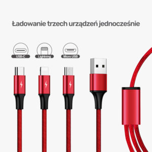Unitek USB Charging Cable 3 in 1 Red has a standard USB input and three outputs for USB-C, microUSB and Lightning that can be used at the same time.