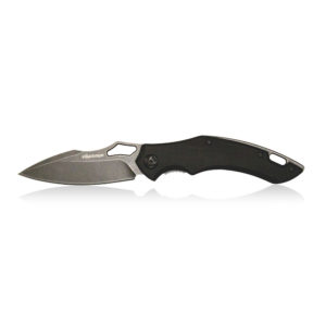 FOX Edge Pop Smoke FE-023 Black G10 Folding Knife by Russ Kommer has an 8Cr13MoV stainless steel blade (in a stone washed PVD coating) and a steel and black G10 composite handle. Knife is opened by thumb-stud (double-sided). The open blade is secured against closing by a frame lock. The knife is equipped with a steel carrying clip.