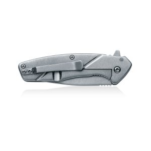 The presented Steelix has a drop point blade with hollow grind and a stonewash finish to hide any scratches. It is opened with a flipper that allows you to quickly unfold the knife, and the frame lock is responsible for blocking. The handle is made entirely of stainless steel. The whole is complemented by a strong, steel clip (Tip-Up).