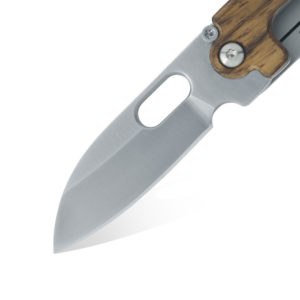 Black FOX Bean Gen2 BF-719 ZW Zebra Wood by Serge Panchenko has a 440C stainless steel sheepsfoot blade (with satin finish) and a steel and Zebra Wood handle. We open the knife blade with one hand using the hole in the blade or with both hands. The knife is equipped with a steel carrying clip.