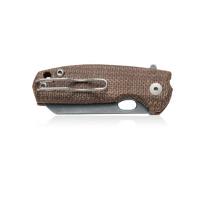 Black FOX Bean Gen2 BF-719 MIN Natural Micarta by Serge Panchenko has a 440C stainless steel sheepsfoot blade (with satin finish) and a steel and brown micarta handle. We open the knife blade with one hand using the hole in the blade or with both hands. The knife is equipped with a steel carrying clip.