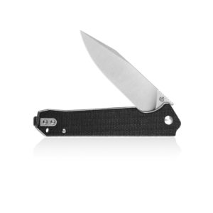 QSP Knife Mamba V2 QS111-G2 Folding Knife Black Stonewashed D2 Black Micarta has a black micarta handle. The black blade of the knife is opened thanks to the flipper protruding from the blade, and it is secured by a liner lock against folding during work.