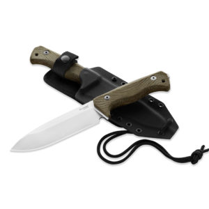 LionSTEEL T6 Green Canvas Satin 3V by Molletta has a full tang construction with a drop point, flat grind, satin finished blade made out of a CPM 3V steel. The handle is made of Solid® one pice green canvas micarta for better comort and grip. It comes with a Kidex sheath that is Molle ready. The knife can be vertically and horizontally carried.