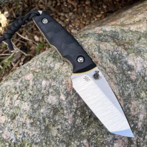 PG Knives Spider Tanto "Adroit" comes with Elmax steel blade with a two-tone finish (satined and sandblasted). The handle is made of black G10 composite with yellow liners. The knife comes with a black Kydex sheath.