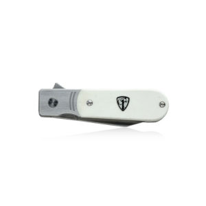 Finch Model 1929 Voodoo Folding Knife has a clip point blade made from American 154CM steel. Knife has steel bolster and body and handle scales from white bone. The handle has a fluorescent insert with the Finch logo. The knife is opened due to the protruding fin (flipper) and the blade is blocked by a frame lock. The knife is equipped with a titanium carrying clip.