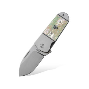 Finch Buffalo Tooth Mother of Pearl has a usable, satin spear point blade with a flat grind, made of American 154 CM steel, and the handle made of titanium with Cocobolo wood overlays. A fluorescent Finch logo is placed in the middle of the handle. The frame lock with a steel insert is responsible for blocking the blade, while the flipper and nail nick, often used in classic folding knives, are used for opening. The blade works on ceramic ball bearings. The knife is equipped with a titanium carrying clip (Tip-Up).