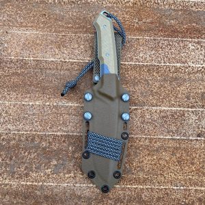 MK Knives & Tools Nomad "Wood Spirit II" has a blade made of the highest quality Vanax steel with an innovative hollow grind (grooves on the blades) and a glassblasted finish. The knife has a Desert Tan G10 composite handle with stabilized wood inserts. The set includes a brown kydex holster decorated with pictograms (owl, river, leaf), enriched with color-matched accessories. The holster is also distinguished by a brown natural leather grommet. The holster can be mounted to MOLLE solutions, thanks to the additional, specially designed kydex buckle included in the set.