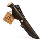 The Children’s Knife has a Rat Tail design. It was equipped with a blade with a rounded tip and flat grinding and vertical manual satining. The ergonomic handle has a finger guard and it is made of birch wood and antlers. The knife comes with a hand-sewn leather sheath to be carried in an upright position.