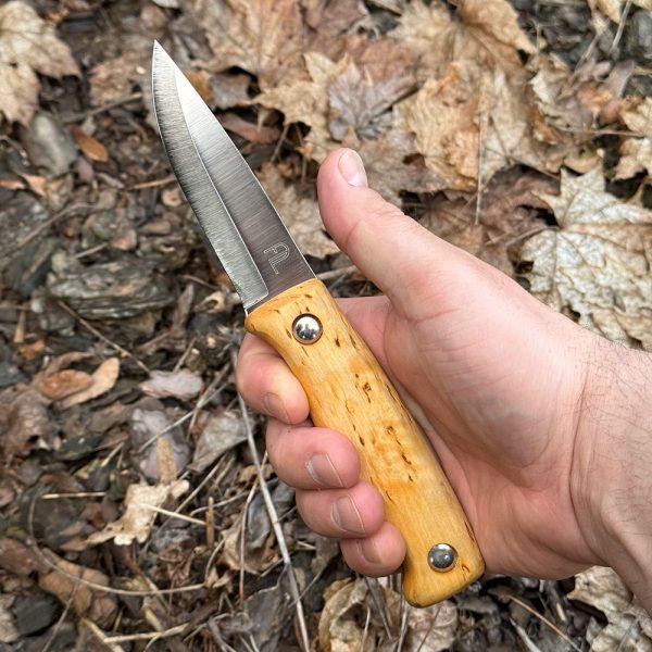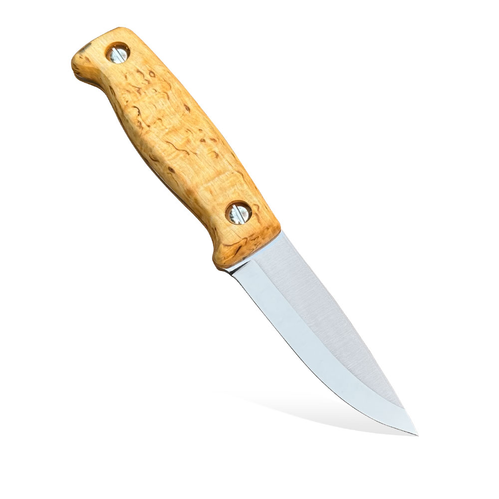 The handle scales are made from Karelian birch, a distinctive Northern European wood with a unique and irregular grain pattern, making each knife one of a kind. This wood has been successfully used for years in traditional Scandinavian knives.