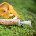 The Mushroom Knife has a Rat Tail design. It is equipped with a blade with a drop point profile and flat grinding and vertical manual satining. The ergonomic handle is made of birch wood and antlers. It is ended with a brush. The knife comes with a hand-sewn leather sheath to be carried in an upright position.
