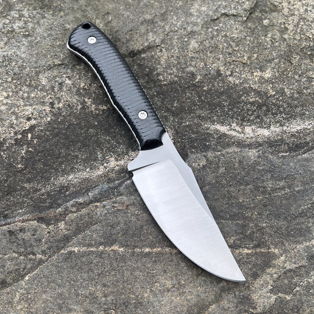- Blade: fixed (full tang), clip point with flat grind, plain cutting edge