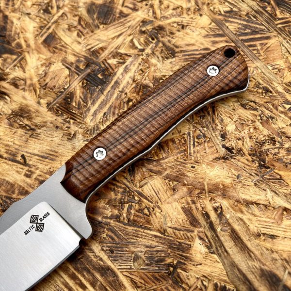 The handle scales are made of ironwood. “Ironwood” refers to various types of wood with very high hardness and density. It is a natural material, extremely durable, and has a beautiful coloration, unique to each piece, hence products made from it have a distinctive and exceptional design. The scales are attached with stainless steel screws, chosen to match the blade finish. They are fitted in such a way that the curved spine of the knife tang subtly protrudes beyond the outline of the scales, enhancing the aesthetic impression.