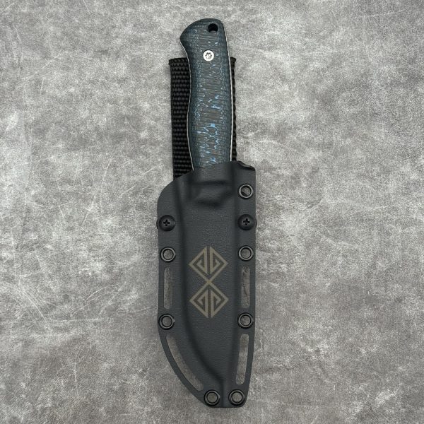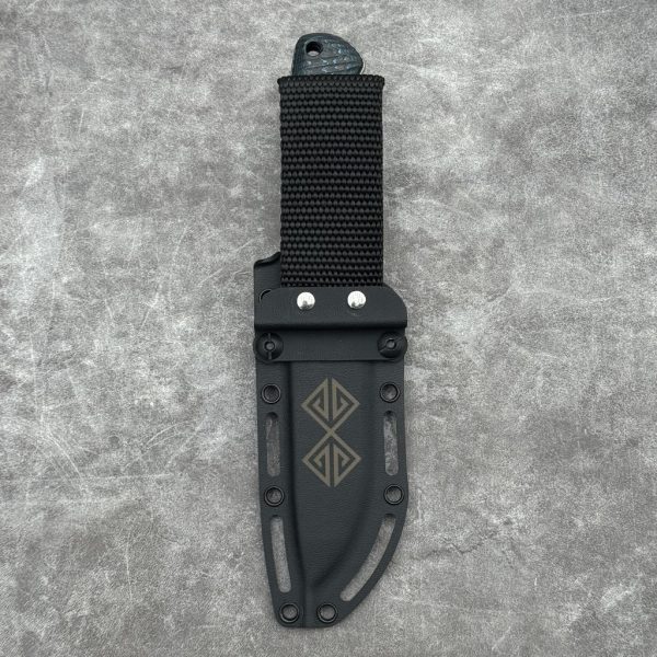 For carrying and storing the knife, a Kydex sheath with a nylon loop is provided, offering flexibility during crouching and other user movements. The sheath has holes that can be used for threading paracord or attaching custom mounting solutions.