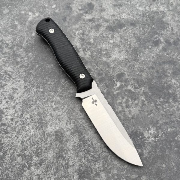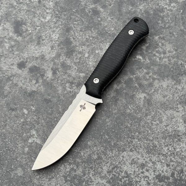 - Blade: fixed (full tang), clip point with flat grind, plain cutting edge