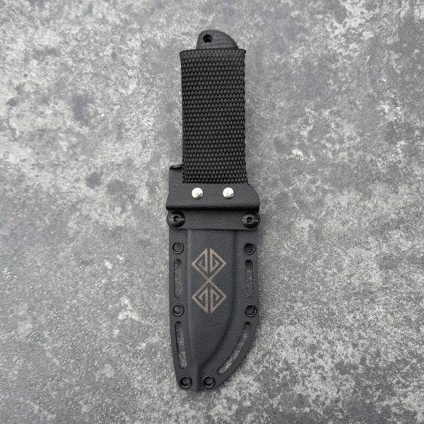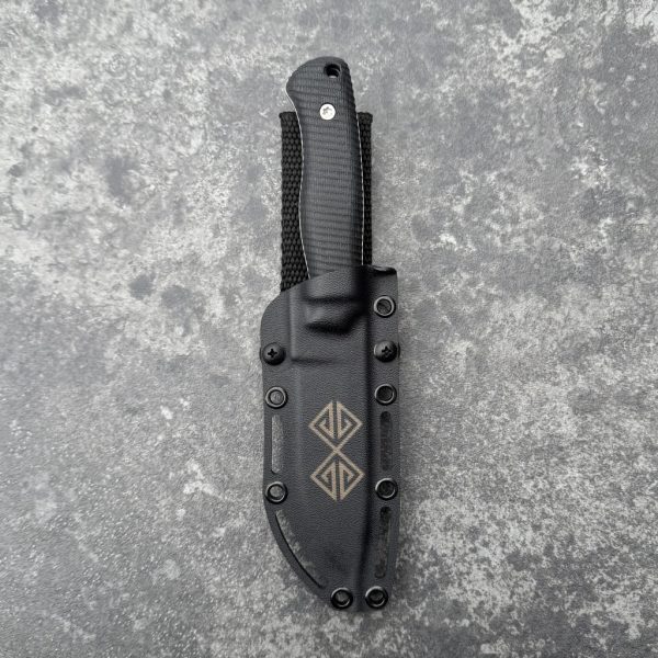 For carrying and storing the knife, a Kydex sheath with a nylon loop is provided, offering flexibility during crouching and other user movements. The sheath has holes that can be used for threading paracord or attaching custom mounting solutions.