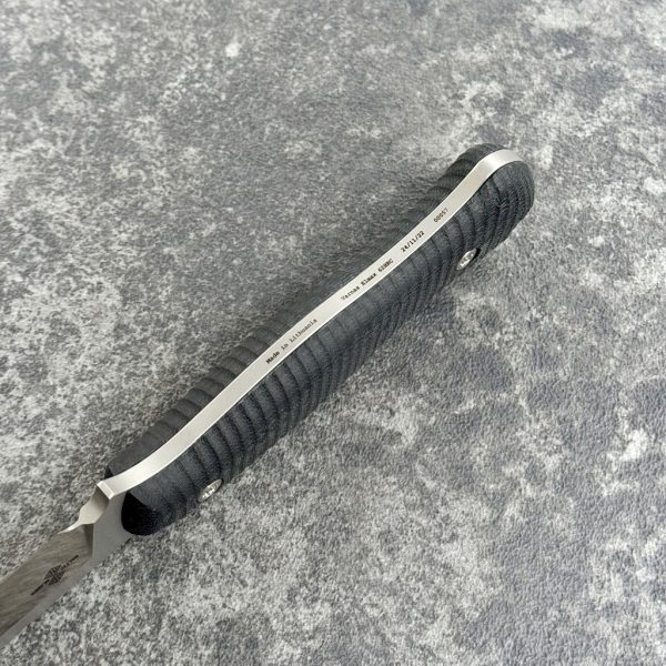 The handle scales, ergonomically contoured and textured, are made of moisture-resistant Micarta laminate, capable of withstanding temperature changes, most solvents, and acids, while offering high resistance to mechanical damage. Micarta, renowned for its excellent properties, including visual appeal (can be stylized to mimic natural materials), features a non-slip, textured structure. The scales are secured with stainless steel screws, chosen to match the blade finish. They are fitted in a way that the contoured spine of the tang subtly protrudes beyond the edges, enhancing the aesthetic appeal. At the end of the handle, there is a designed hole for additional securing of the knife with a lanyard, paracord, etc..