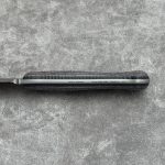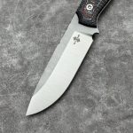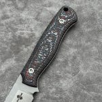 The ergonomic, oval-shaped handle scales are made from premium FatCarbon carbon fiber* with black G10 composite liners. G10 is highly resistant to moisture, temperature changes, most solvents and acids, and mechanical damage. The material features a textured pattern that prevents the handle from slipping in your hand, ensuring a secure grip even in challenging conditions. The scales are fastened with steel screws finished to match the blade’s appearance, maintaining a cohesive design.