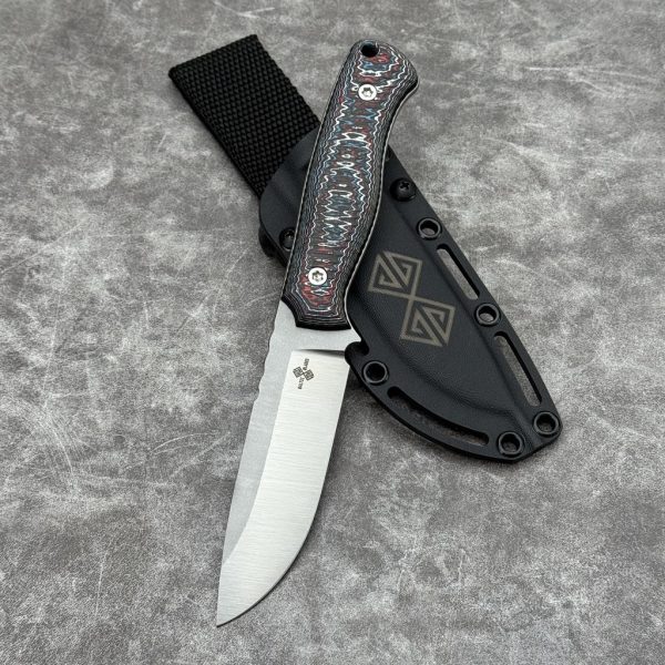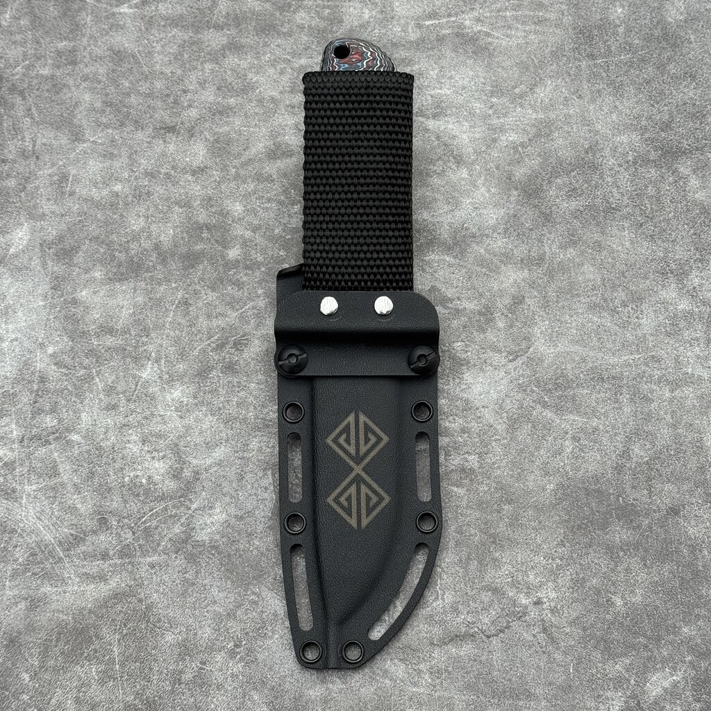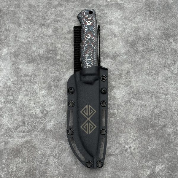 For carrying and storing the knife, a Kydex sheath with a nylon loop is provided, offering flexibility during crouching and other user movements. The sheath has holes that can be used for threading paracord or attaching custom mounting solutions.