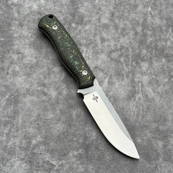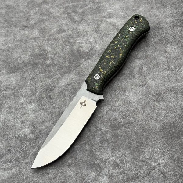 The ergonomic, oval-shaped handle scales are made from premium FatCarbon carbon fiber* with black G10 composite liners. G10 is highly resistant to moisture, temperature changes, most solvents and acids, and mechanical damage. The material features a textured pattern that prevents the handle from slipping in your hand, ensuring a secure grip even in challenging conditions. The scales are fastened with steel screws finished to match the blade’s appearance, maintaining a cohesive design.