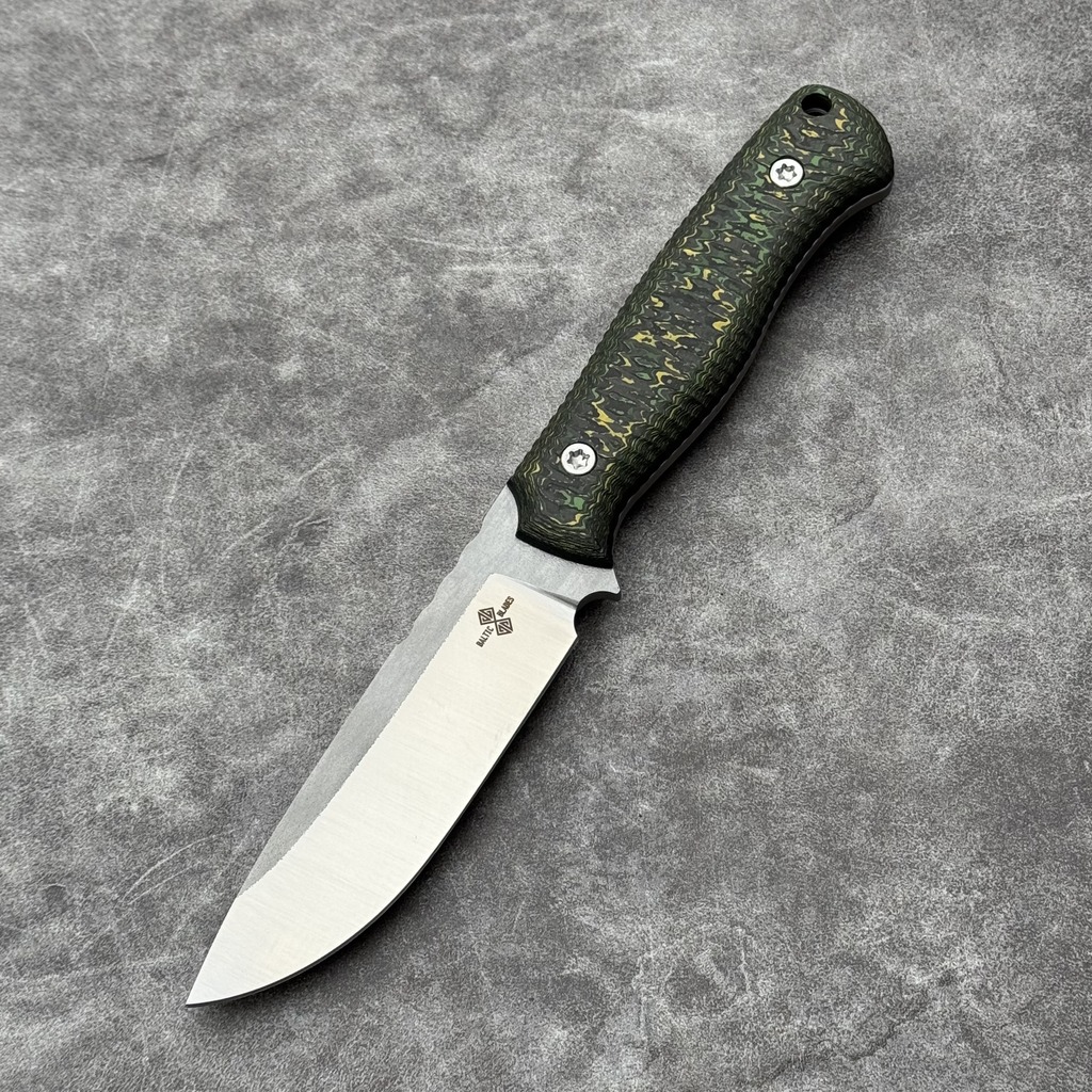 The knife is constructed with a full-tang design, meaning it is made from a single piece of steel that runs the entire length and width of the handle, with the handle scales securely attached. This design is one of the most durable available for fixed-blade knives.