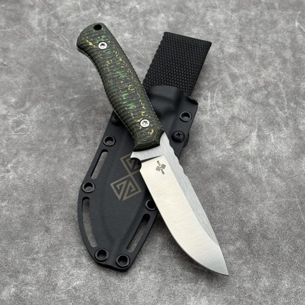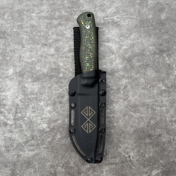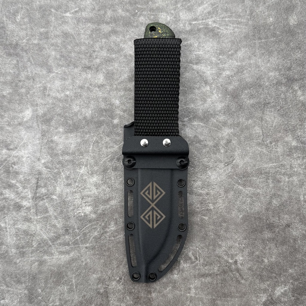 For carrying and storing the knife, a Kydex sheath with a nylon loop is provided, offering flexibility during crouching and other user movements. The sheath has holes that can be used for threading paracord or attaching custom mounting solutions.