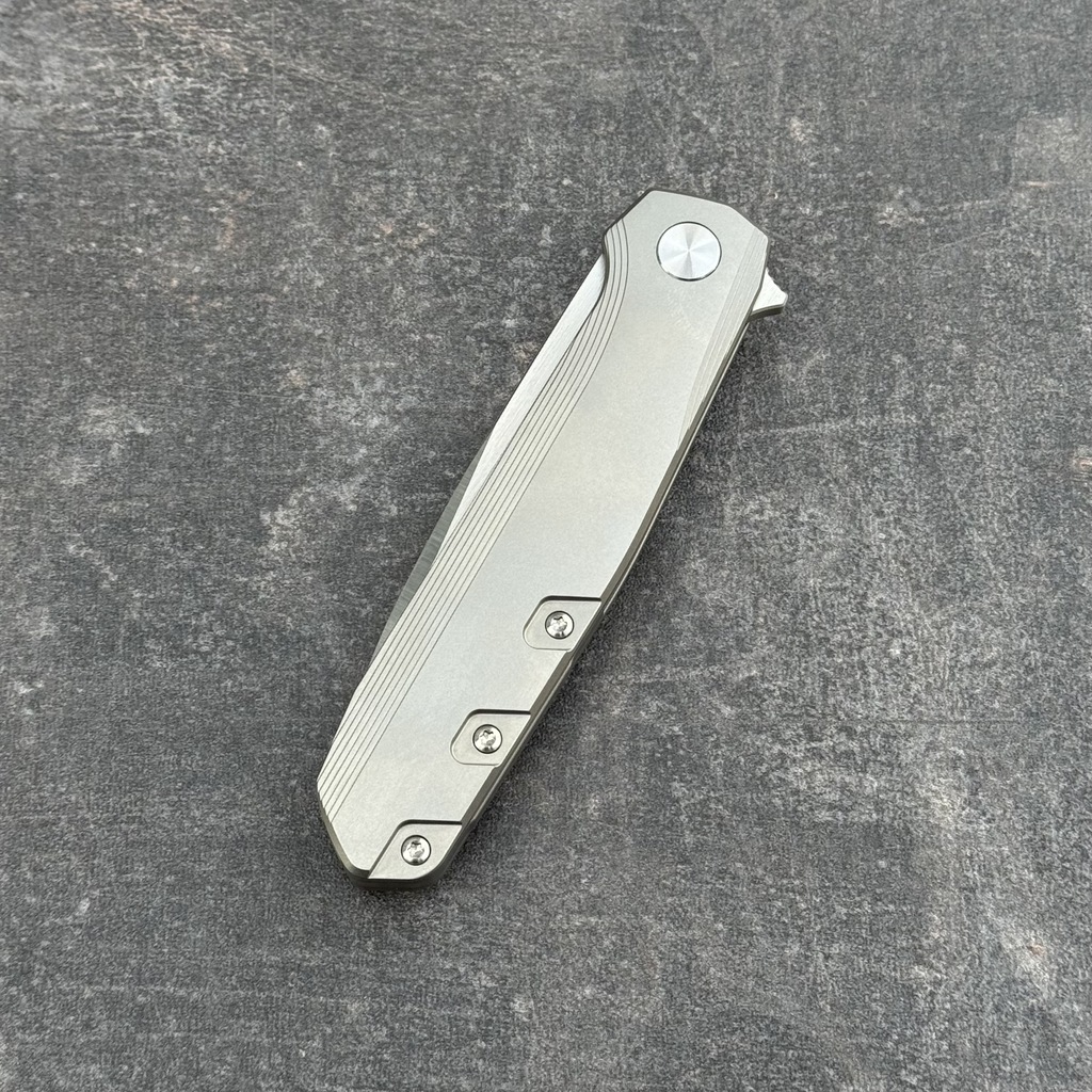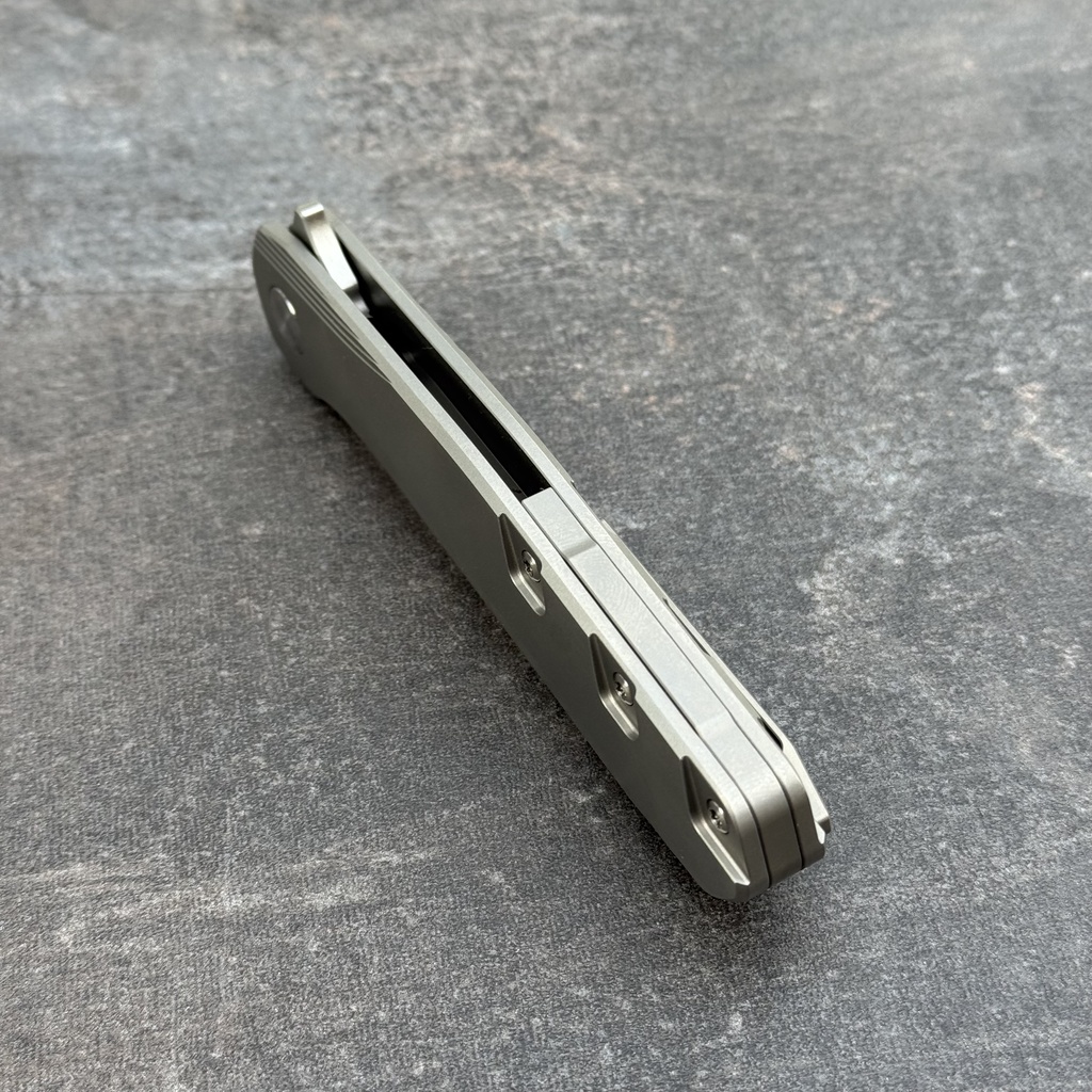 The handle is crafted from lightweight, durable titanium with bead blasted finish.