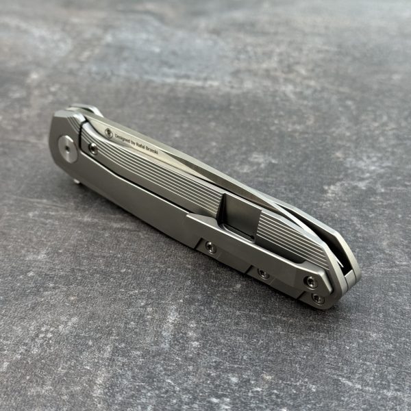 A titanium clip in a tip-up position allows for secure and discreet pocket carry with the blade tip facing upwards.