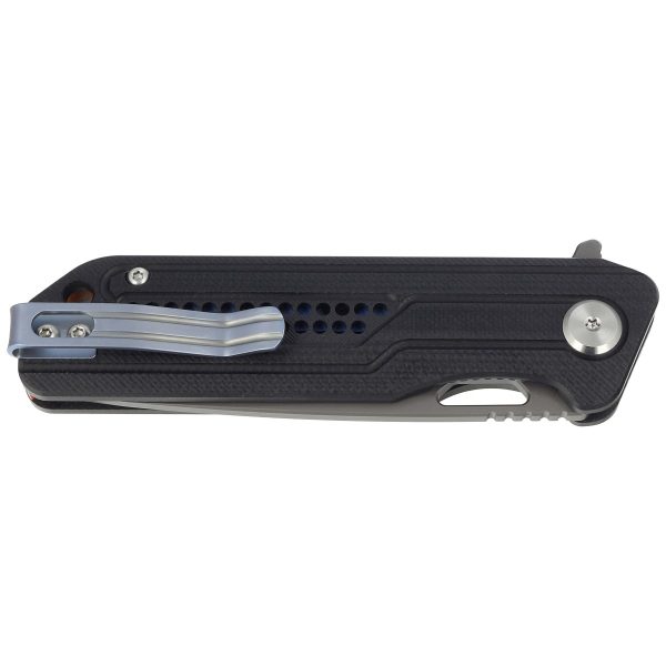 Głownia tego noża to szeroki Drop Point z szarą powłoką tytanową. Wydatny brzusiec wydłuża długość krawędzi tnącej w stosunku do długości klingi, zbiegając się w kierunku ostrego jak igła czubka noża. Grubość klingi zapewnia wysoką wytrzymałość, a wysoki, płaski szlif gwarantuje doskonałą geometrię krawędzi tnącej oraz niezwykłą wydajność cięcia. Mechanizm otwierania klingi jest wspomagany przez łożyska kulkowe, a płetwa flippera po otwarciu pełni funkcję jelca. Noża można również otworzyć przy pomocy owalnego otworu w klindze (thumb hole). Fragment grzbietu klingi pokryto karbowanym oparciem pod kciuk, zapewniającym doskonałą kontrolę nad nożem. Całość zabezpieczona jest sprawdzoną i popularną blokadą liner lock.