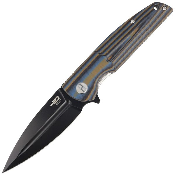 Bestech Fin Black / Blue / Brown G10, Black Stonewashed 14C28N Folding Knife (BG34D-3)