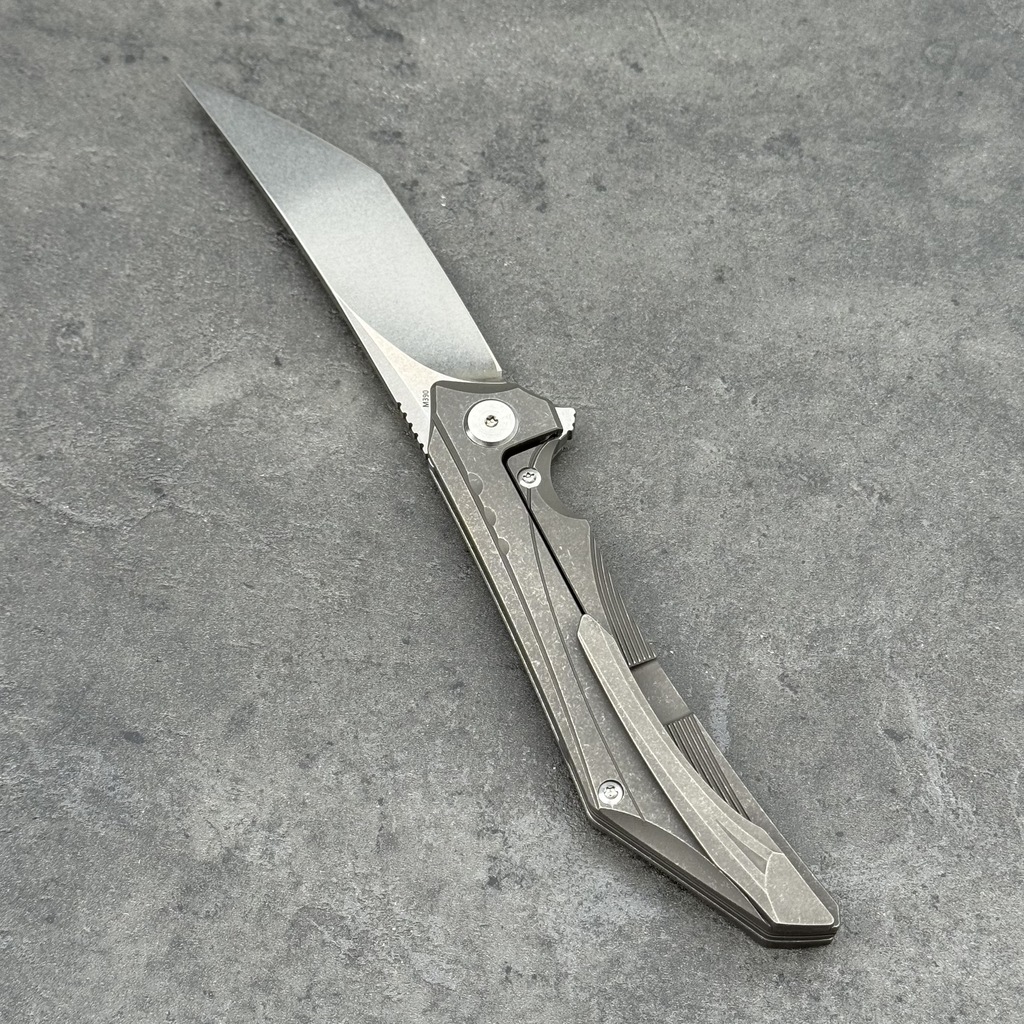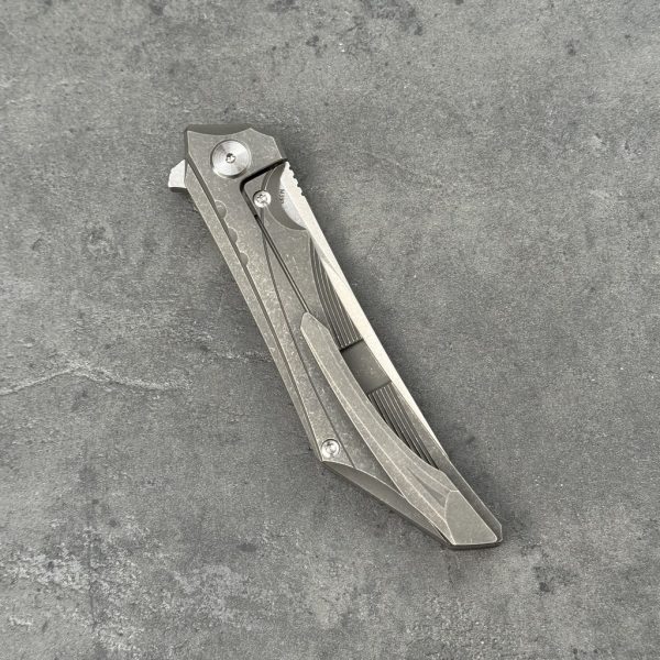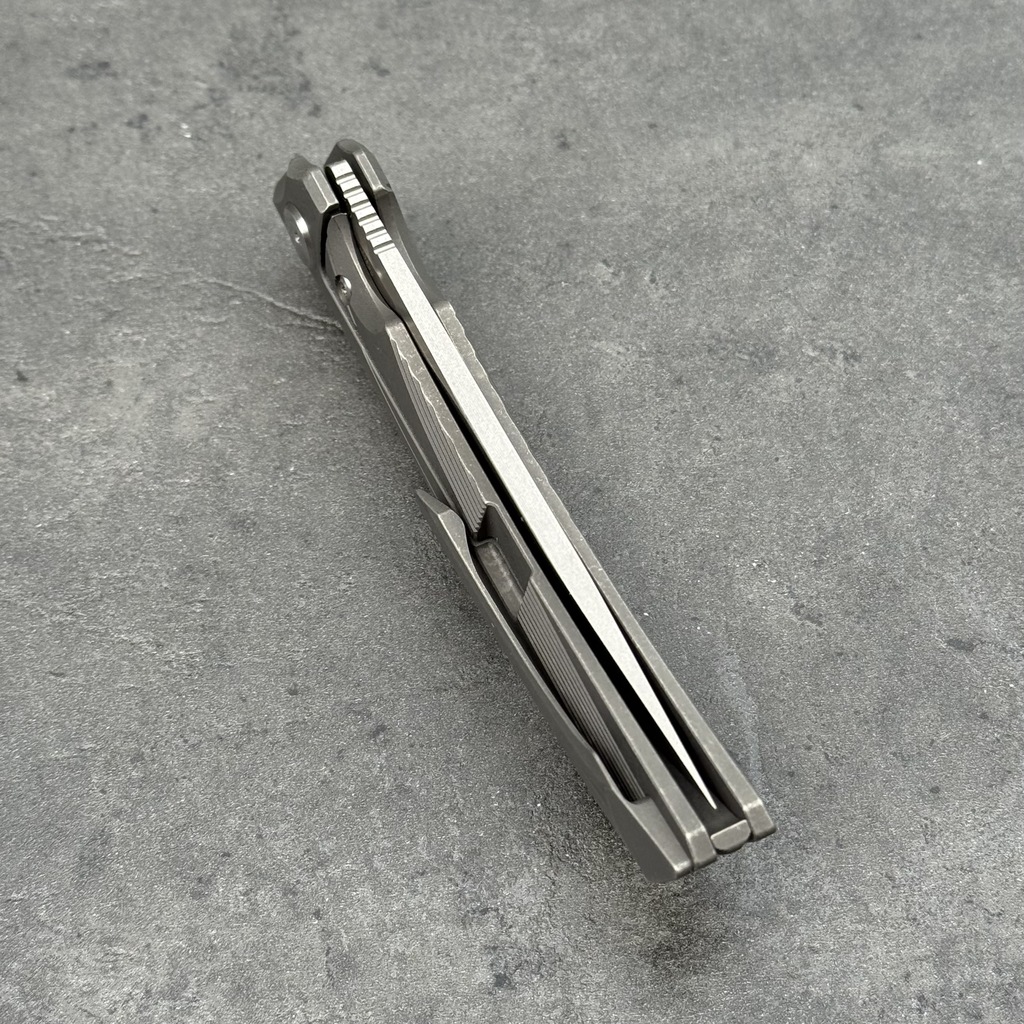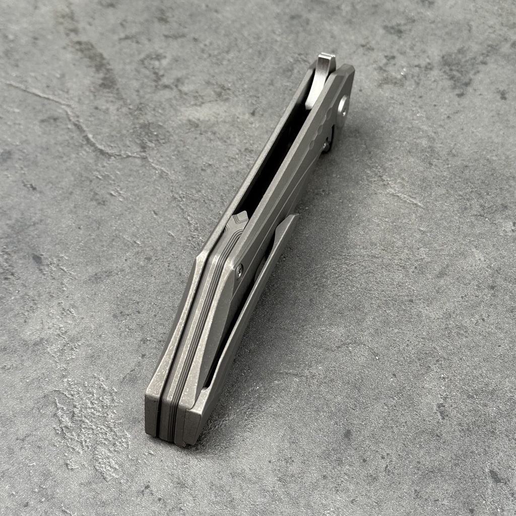 The handle is crafted from lightweight, durable titanium with dark grey finish.