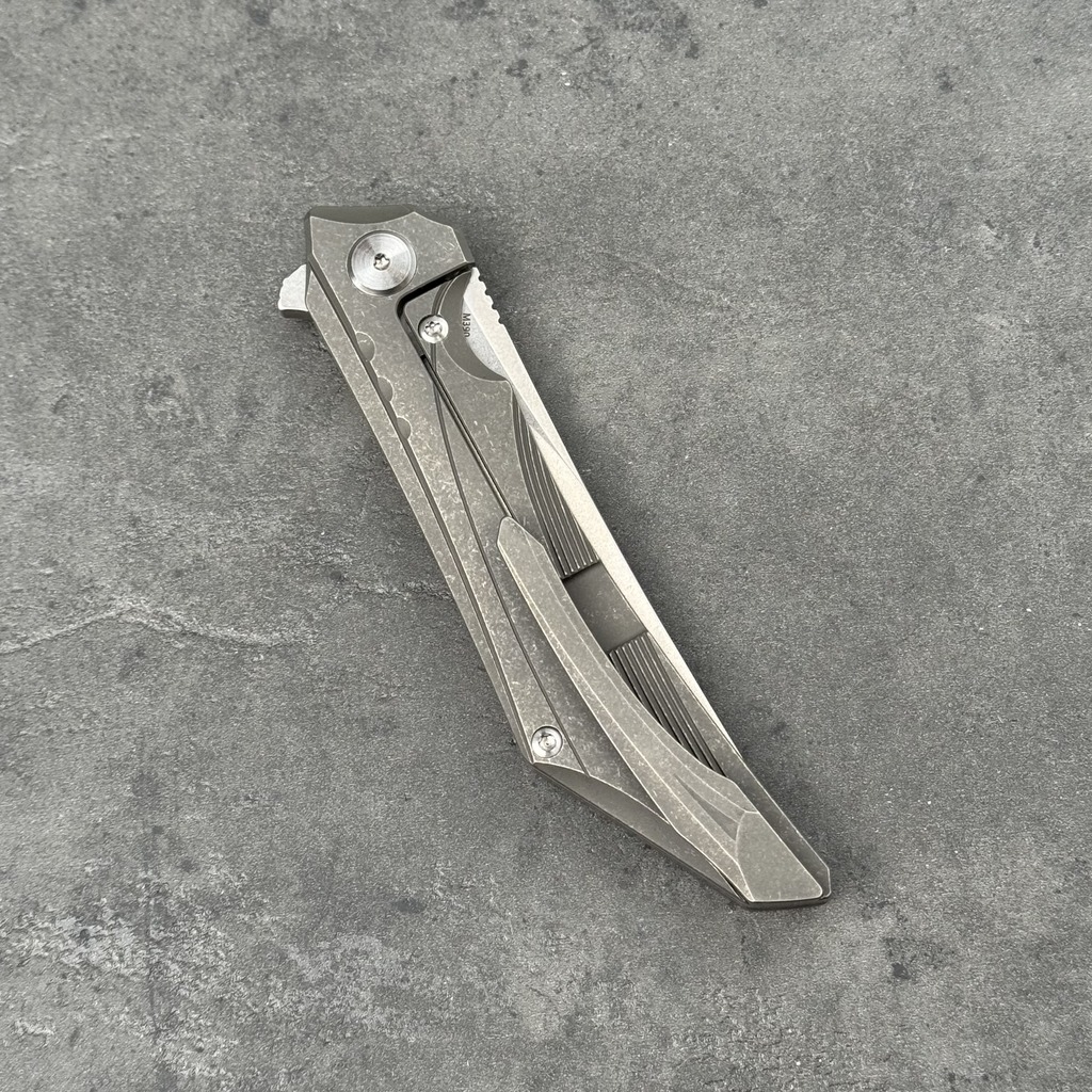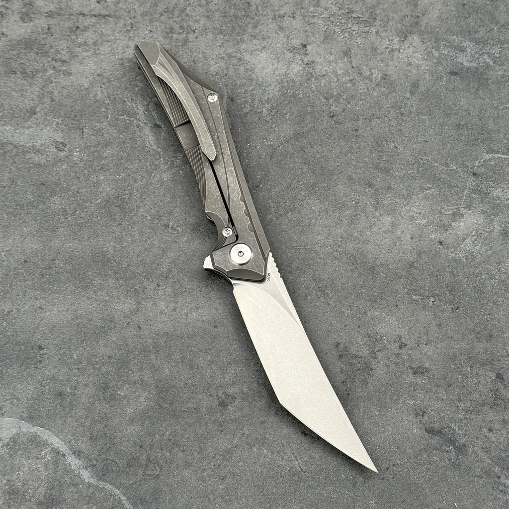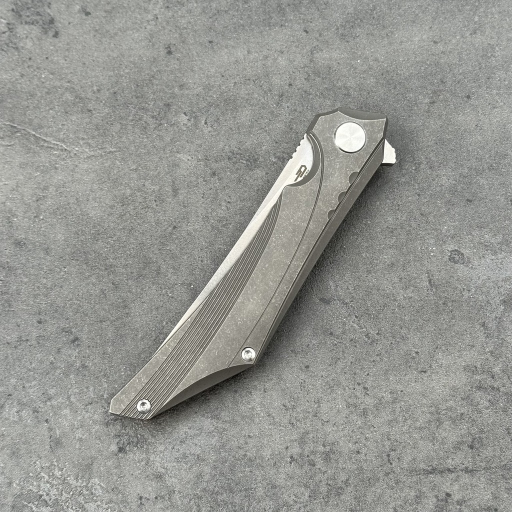 The handle is crafted from lightweight, durable titanium with dark grey finish.