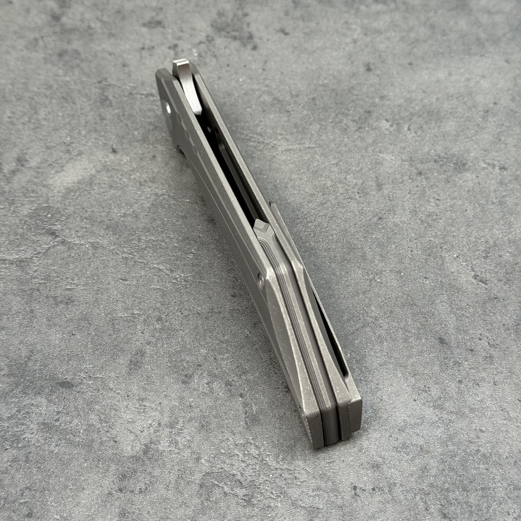 A titanium clip in a tip-up position allows for secure and discreet pocket carry with the blade tip facing upwards.