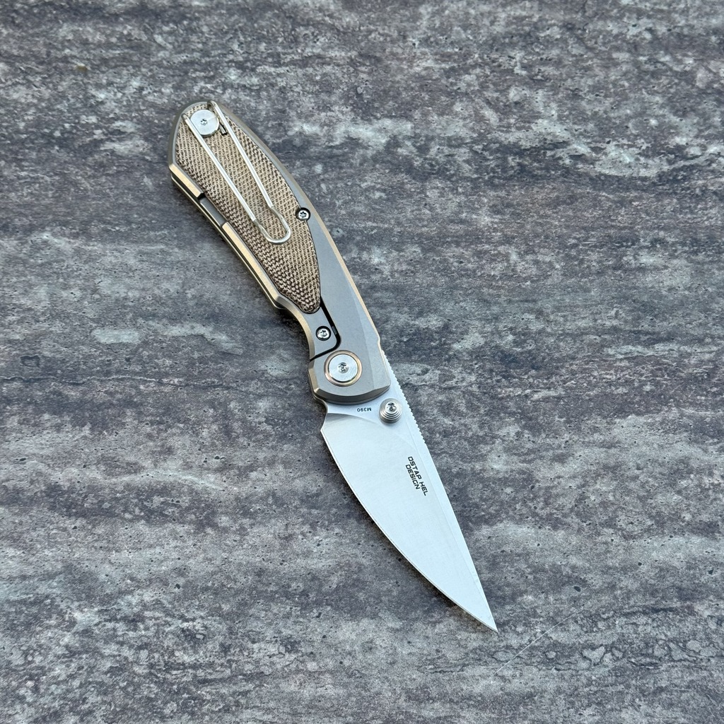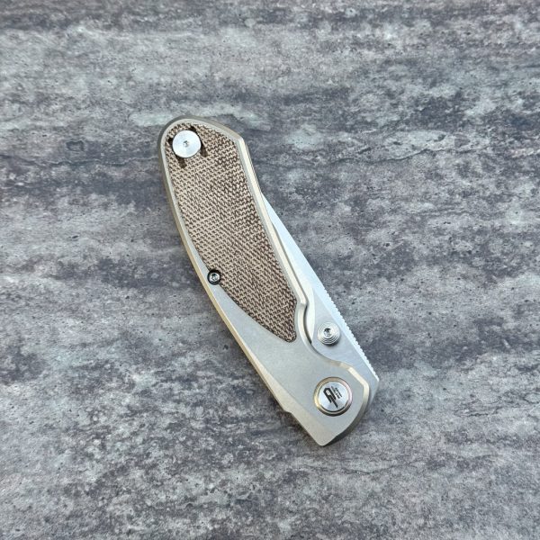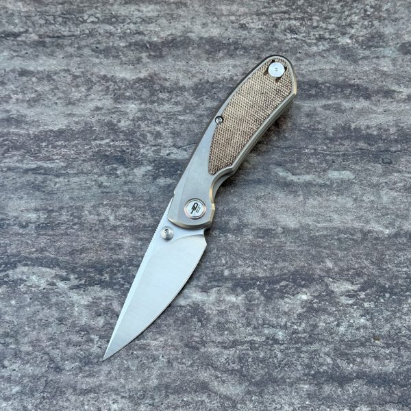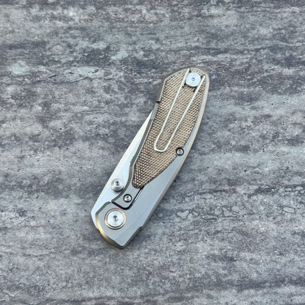 - Handle: Anodized titanium (grey) with Natural Canvas Micarta inlays, reversible wire clip (Tip-Up)