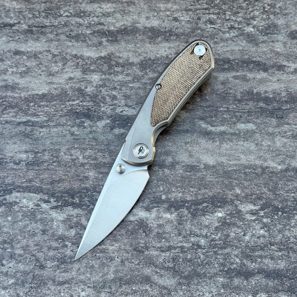 Bestech Lito BT2307B Folding Knife by Ostap Hel – SPECIAL COLLECTOR’S SET WITH AUTOGRAPH | Satin M390 Grey Titanium & Natural Canvas Micarta Inlays