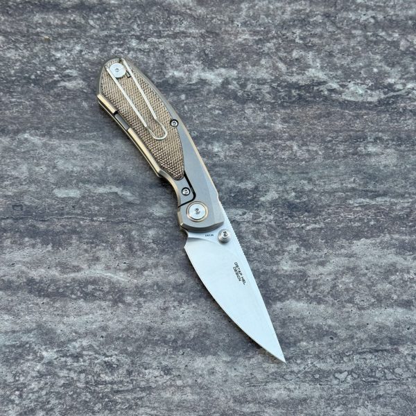 The handle is crafted from lightweight, durable titanium, anodized in a selected color, and enriched with micarta inlays for added grip and character.