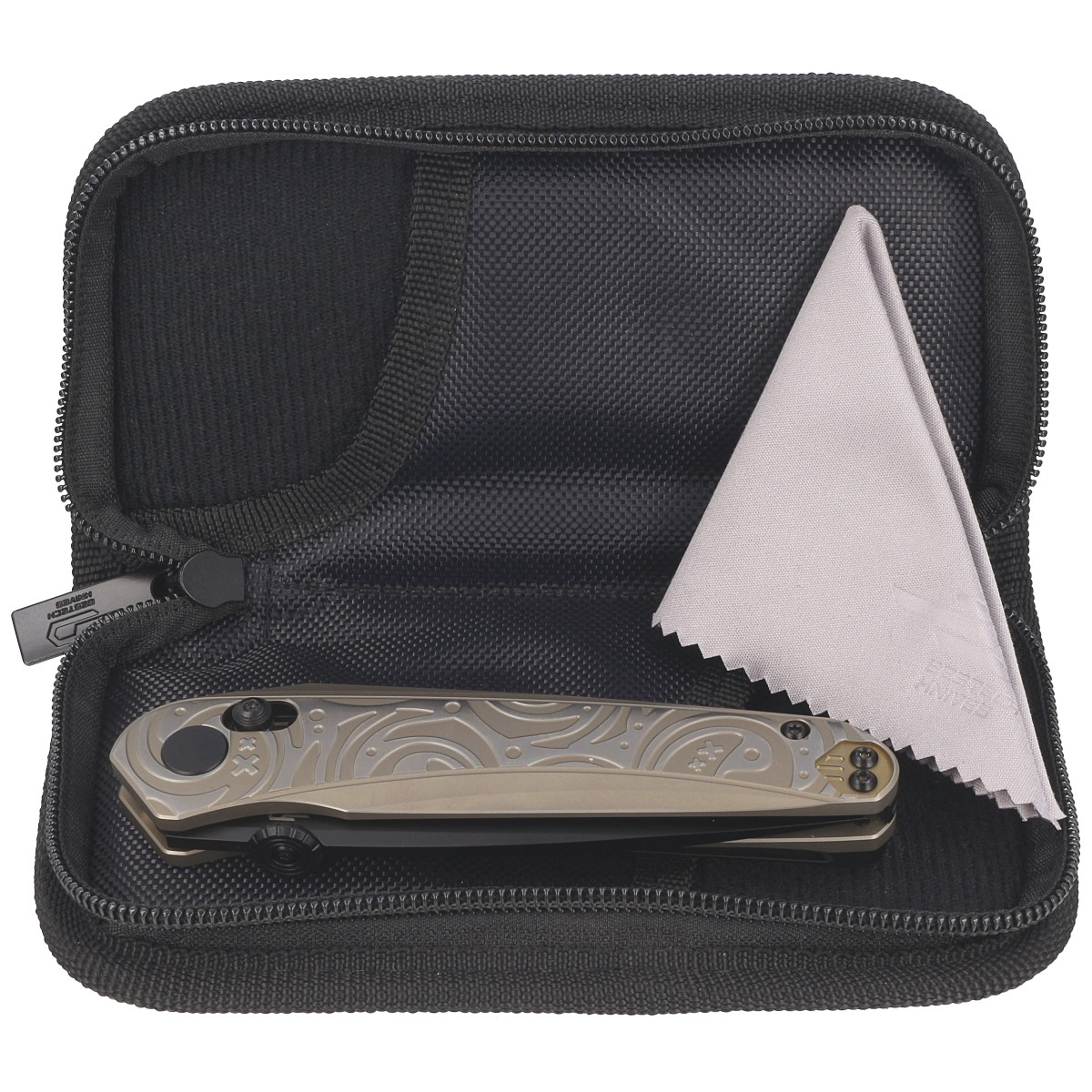 Nóż Mothus Light Bronze Titanium dostarczany jest w miękkim etui z nylonu, zapinanym na zamek, z logo marki. To idealne rozwiązanie do bezpiecznego przechowywania i przenoszenia tego wyjątkowego foldera.