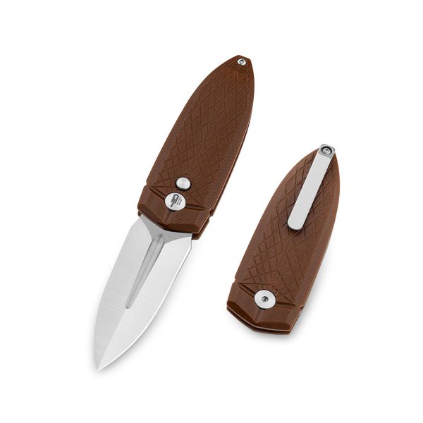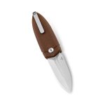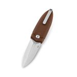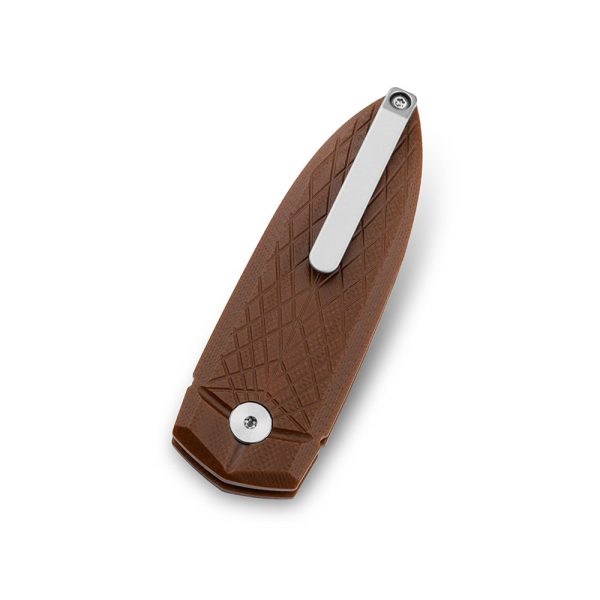 - Rękojeść: okładki z G10 (brązowe – brown), stalowy klips mocujący (jednostronny, Tip-Up)