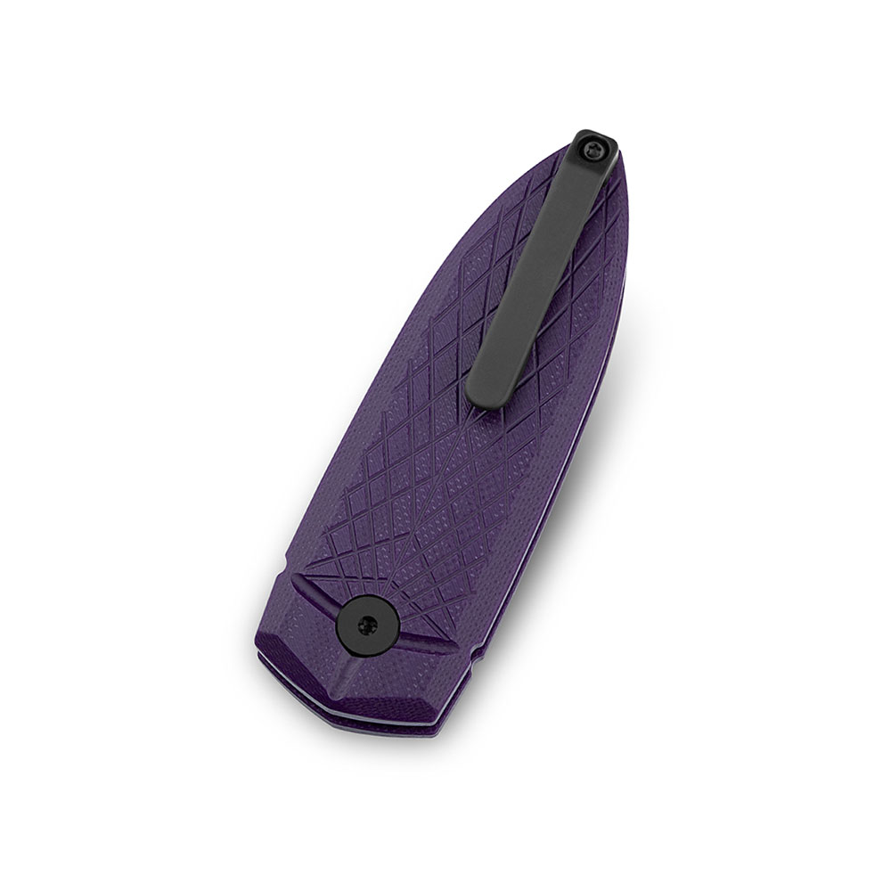 - Rękojeść: okładki z G10 (fioletowe – purple), stalowy klips mocujący (jednostronny, Tip-Up)