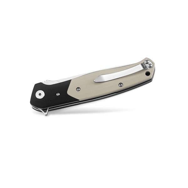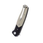 - Rękojeść: stalowe linersy, okładki z czarnego i beżowego G10, backspacer z G10, stalowy klips mocujący (jednostronny, tip-up, deep carry)