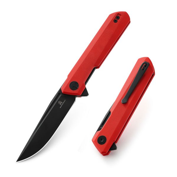 - Rękojeść: stalowe linersy, okładki z czerwonego G10 (red G10), stalowy klips mocujący (przekładalny, Tip-Up)