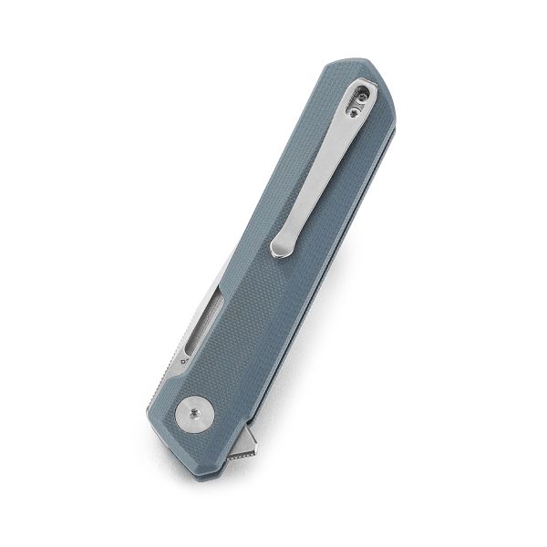 - Rękojeść: stalowe linersy, okładki z szarego G10, stalowy klips mocujący (przekładalny, Tip-Up)