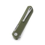 - Rękojeść: stalowe linersy, okładki z zielonego G10, stalowy klips mocujący (przekładalny, Tip-Up)