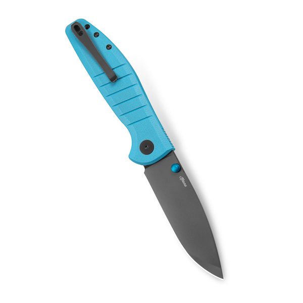 - Rękojeść: stalowe linersy, okładki z niebieskiego G10 (Blue G10), niebieski kołek, stalowy klips mocujący (przekładalny, Tip-Up)
