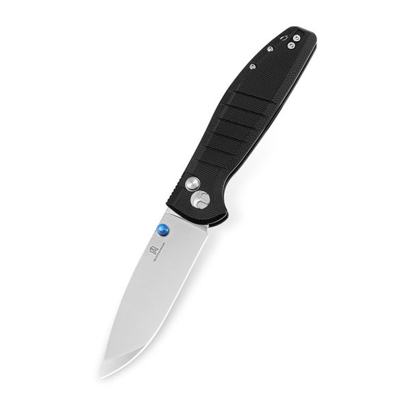 Nóż składany Bestechman Button Lock Satin/Flat Stonewash D2 Black G10 by Keanu BMK04A to folder o klasycznej linii i uniwersalnym ostrzu z dodatkowym, wyróżniającym je szlifem na wierzchołku skutkującym lepszymi właściwościami penetracyjnymi podczas użytkowania. Bardzo ergonomiczna rękojeść współgra świetnie z ostrzem otwieranym obustronnym kołkiem oraz zapewniającą bezpieczeństwo blokadą z przyciskiem Button Lock.