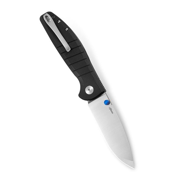- Rękojeść: stalowe linersy, okładki z czarnego G10 (Black G10), niebieski kołek, stalowy klips mocujący (przekładalny, Tip-Up)