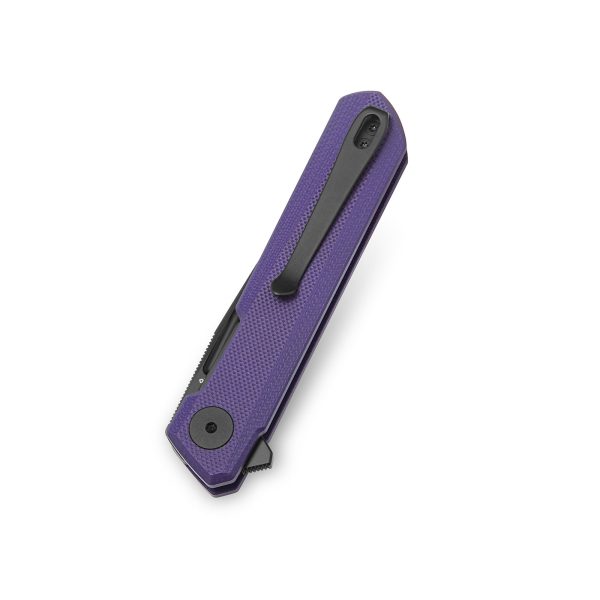 - Rękojeść: stalowe linersy, okładki z fioletowego G10, stalowy klips mocujący (przekładalny, Tip-Up)