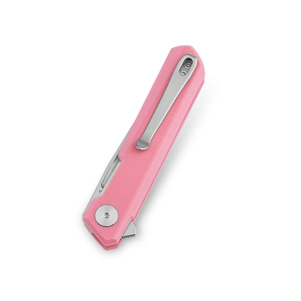 - Rękojeść: stalowe linersy, okładki z różowego G10 (pink G10), stalowy klips mocujący (przekładalny, Tip-Up)