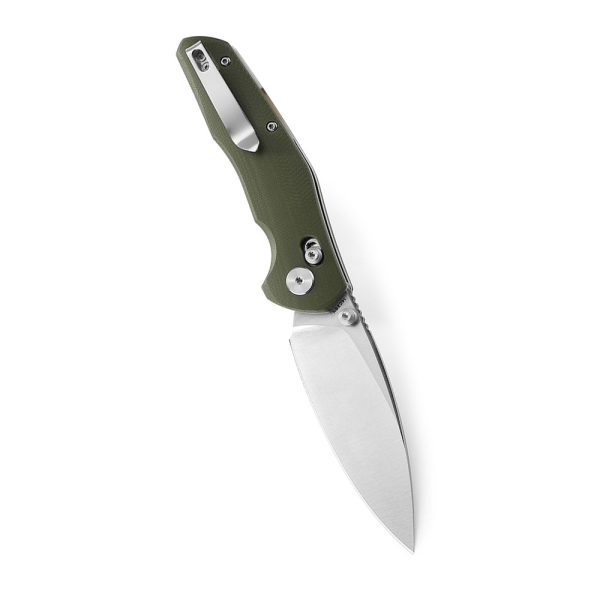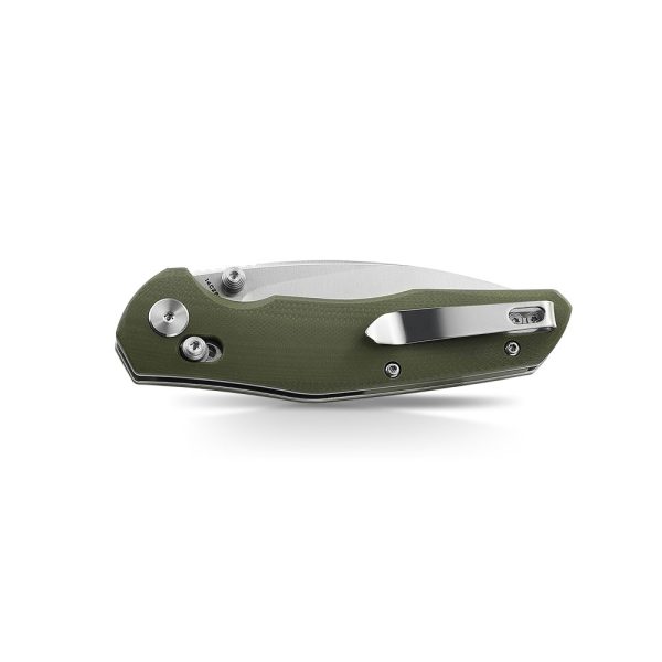 - Rękojeść: stalowe linersy, okładki z zielonego G10 (OD Green G10), stalowy kołek, stalowy klips mocujący (jednostronny, Tip-Up)