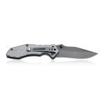 The blade of the knife is made of stainless steel 440. This steel has very good cutting properties and is easy to sharpen. The clip point blade has a hollow grind and titanium coating. The spine has a jimping and swedge, improving penetrating properties. Thumb studs are used to open the knife.