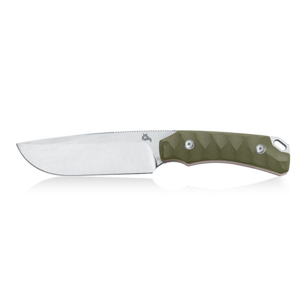 - Blade: fixed blade (full tang), drop point style blade with flat grind, plain cutting edge